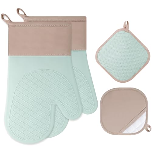 Cozary Lot de 4 Gants de Cuisine, 1 Paire Gants de Cuisine avec 2 Maniques Cuisine, Antidérapants Silicone Gant Cuisine Anti Chaleur pour BBQ, Cuisson au Four, Cheminée - Vert Clair