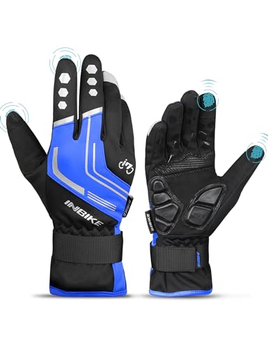 INBIKE Gants Velo Homme VTT Hiver Cyclisme de Route Chaud Thermique Impremeable Tactile Femme Gant Cycliste Chauffant Travail Gel Rembourre Coupe-Vent Bleu M