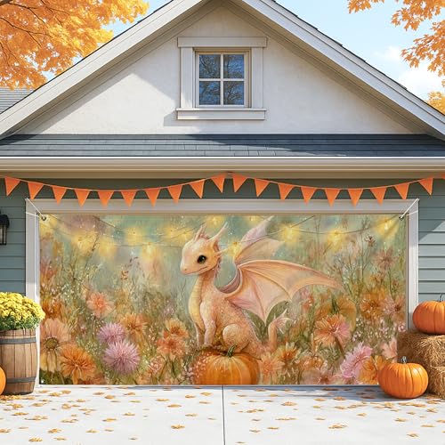 Housse de porte de garage d'automne avec motif dragon mignon - Grandes décorations de porte de garage sur le thème de la récolte d'automne - Décoration d'intérieur et d'extérieur - Décoration de fond