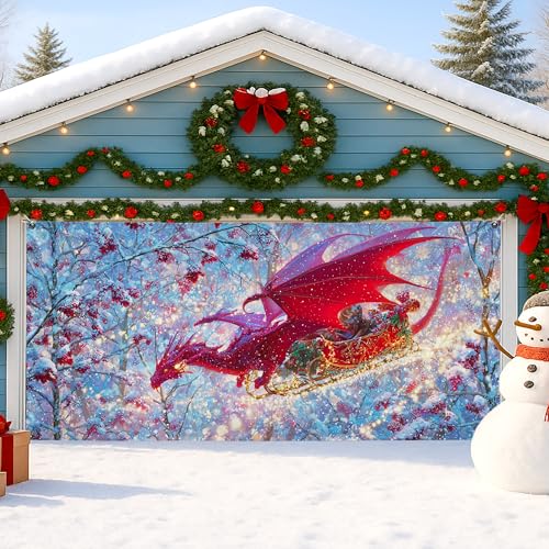Housse de porte de garage fantaisie motif dragon, grandes décorations de vacances pour l'hiver, Noël, décoration extérieure et intérieure, 397 x 180 cm