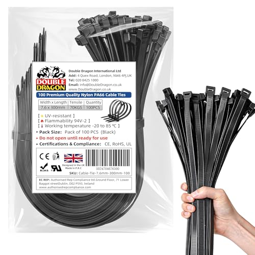 Double Dragon Lot de 100 attaches autobloquantes robustes en nylon PA66 de qualité industrielle pour la maison, le bureau, le garage et l'atelier Noir 300 x 7,6 mm
