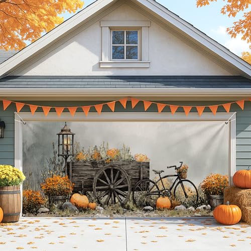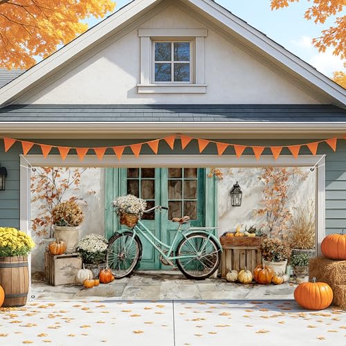 Housse de porte de garage vintage pour vélo, décoration d'automne rustique pour grandes portes de garage, décoration extérieure d'automne pour Halloween et Thanksgiving, 397 x 180 cm