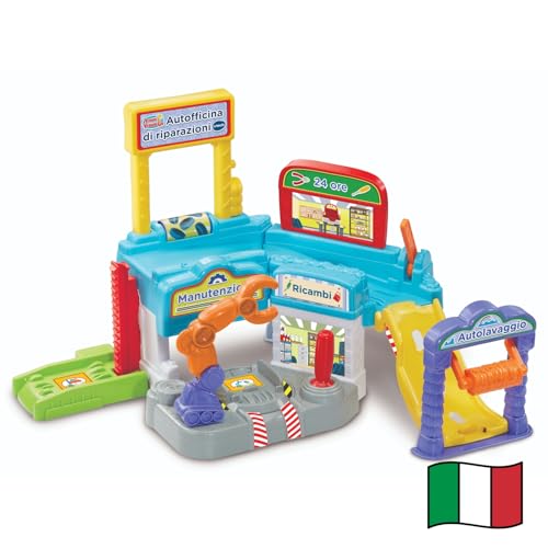 VTech Vroom Vroom Go - Voiture de réparation, Piste de Voiture avec Garage Multifonction, Bras robotique, Comprenant 1 véhicule, 3 Zones Magiques, Langue Italienne, Batteries incluses, 1-5 Ans
