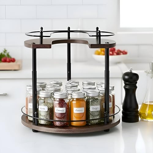 Étagère à Épices Pivotante 2 Niveaux, Organisateur avec Plateau Tournant Réglable en Hauteur, pour Armoire, Plan de Travail & Garde-Manger – Support de Rangement en Bois 30,5cm, Compact & Polyvalent
