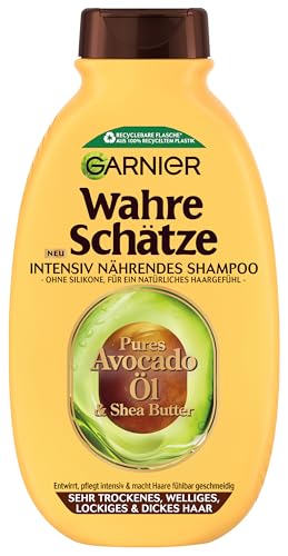 Garnier Wahre Schätze Shampooing nourrissant intense à l'huile d'avocat pure et au beurre de karité pour cheveux secs, sans silicone, pour tous les types de boucles, plus de douceur, 250 ml
