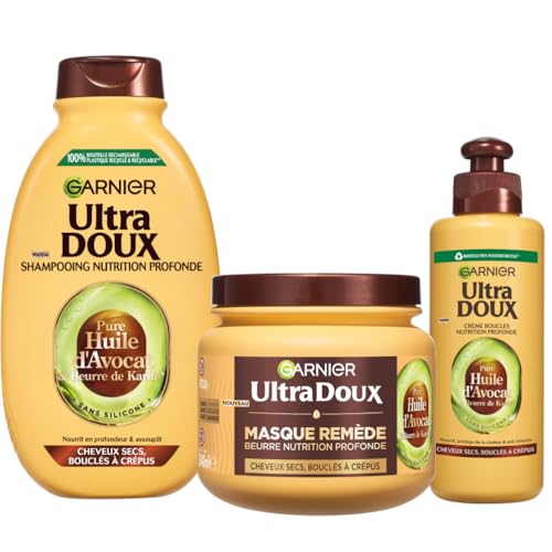Garnier Ultra Doux - Routine pour Raviver les Boucles des Cheveux Secs, Bouclés à Crépus - À l'Huile d'Avocat et Beurre de Karité - Shampooing, Après-Shampooing et Masque - Homme & Femme