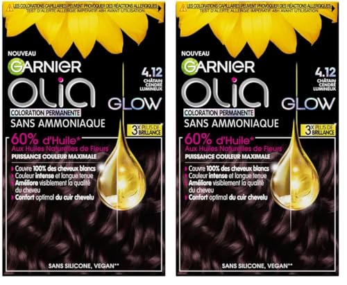 Garnier Coloration Permanente - Sans Ammoniaque - Aux Huiles Naturelles de Fleurs - Châtain Cendré Lumineux (4.12) - Olia Glow (Lot de 2)