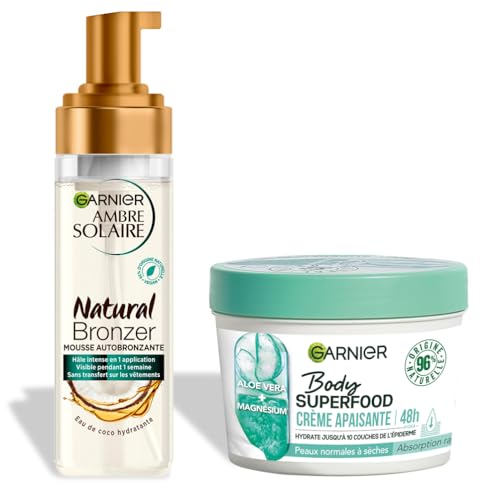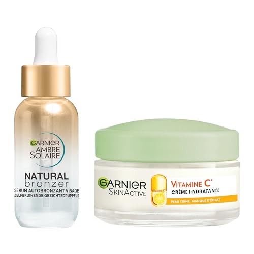 GARNIER - Routine Hydratation & Éclat - Sérum Autobronzant Ambre Solaire - Acide Hyaluronique & Eau De Coco - Crème Hydratante Bio Skin Active - Vitamine C - Tous Types de Peaux