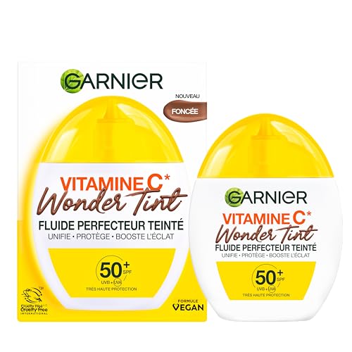 GARNIER - SkinActive Vitamine C - Fluide Perfecteur Teinté Wonder Tint SPF50+ - Soin Teinté Visage Protecteur - Unifie, Hydrate & Réduit les Taches Brunes - Tous Types de Peaux - Teinte Foncée - 40 ml