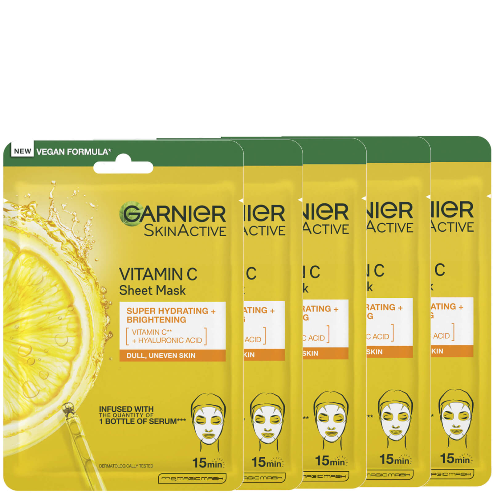GARNIER Skin Active - Lot De 5 Masques Tissu Booster D'Éclat - Illumine, Hydrate & Repulpe La Peau - Vitamine C Et Acide Hyaluronique - Vegan & Cruelty Free - Peaux Ternes - x5