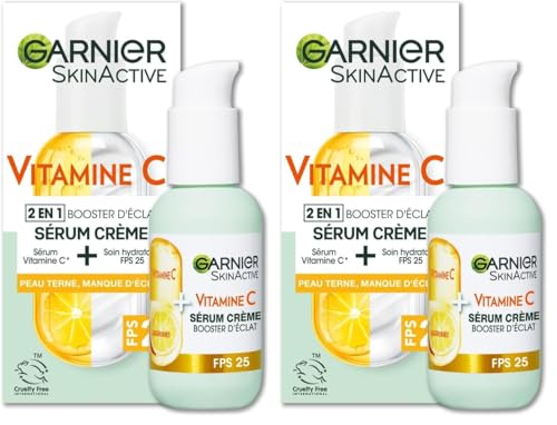 GARNIER Skin Active - Sérum Crème Booster D'Éclat 2-En-1 - Hydratation 72h & Éclat - FPS 25 - Vitamine C & Agrumes - Vegan & Cruelty Free - Peaux Ternes En Manque D'Éclat - 50 ml (Lot de 2)
