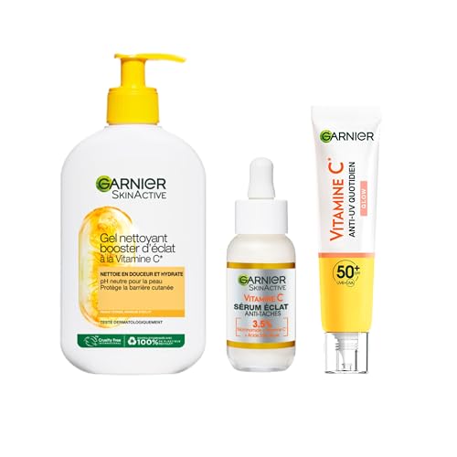Garnier SkinActive - Coffret Routine Eclat Vitamine C – Gel Nettoyant Booster d’éclat + Sérum Anti-Taches Brunes + Fluide Anti-UV Quotidien Glow SPF50+ - Enrichis en Vitamine C - Tous Types de Peaux