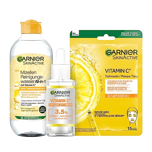 Garnier Kit de soin du visage avec eau micellaire, sérum à la vitamine C et 5 masques pour un teint éclatant, Skin Active