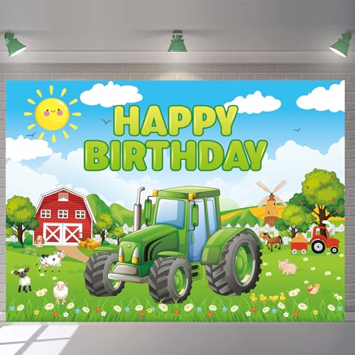 Toile de fond pour photographie de tracteur vert - 2,4 x 1,8 m - Motif tracteur de grange rouge - Bannière pour fête d'anniversaire d'enfant - Décoration de table de gâteau