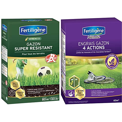 Fertiligene Gazon Super Résistant Label Rouge, 80m² & Engrais Gazon 4 Actions, 2,45kg, 60m²