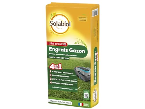 SOLABIOL Engrais Gazon 4 En 1 - Sac 10 Kg - Jusqu'à 250m² - Nutrion Longue Durée - Effet Reverdissant - Limite Les Mauvaises Herbes - Stimule L'Enracinement SOGAZYPRO10