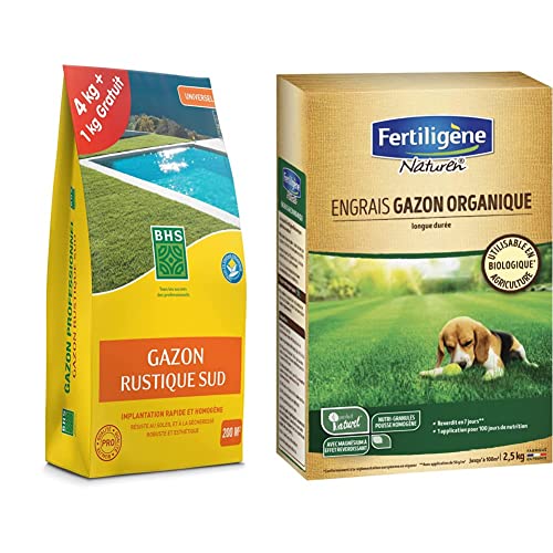 BHS GRSP4 Gazon Rustique Sud 5 kg | Soit 200 m² | Semences Enrichies en Engrais Organique pour Une Implantation Rapide Et Homogène, Fabriqué en France & NATUREN Engrais Gazon Organique 100m² 2,5kg