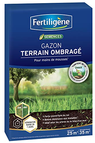 FERTILIGENE OMBR25 - Semences Gazon Terrain Ombragé 875 g - Premières pousses en 1 semaine - Limite les mousses et résiste aux maladies - Zones à faible ensoleillement (sous les arbres) - Pour 200m²