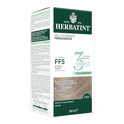 Herbatint Gel Colorant Permanent 3Dosi, 300 ml – Permanent 3 doses – FF5 blonde sable, sans ammoniaque, pour peaux sensibles, 100% couverture cheveux blancs, avec 8 extraits naturels bio