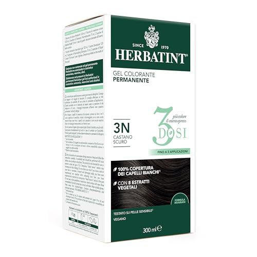 Herbatint Gel colorant permanent 3doses, 300 ml – 3 N marron foncé, sans ammoniaque, pour peaux sensibles, 100% couverture cheveux blancs, avec 8 extraits naturels bio