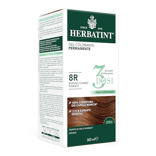 Herbatint Gel Colorant Permanent 3Dosi, 300 ml - 8R Blond Clair Cuivré Sans Ammoniaque pour Peaux Sensibles, 100% Couverture Cheveux Blancs avec 8 Extraits Naturels Bio
