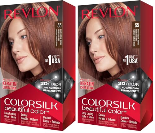 Revlon Colorsilk Beautiful Color Coloration Permanente des Cheveux avec Technologie au Gel 3D et Kératine, Teinture avec Couvrance à 100% des Cheveux Blancs, 55 Brun Roux Clair (Lot de 2)