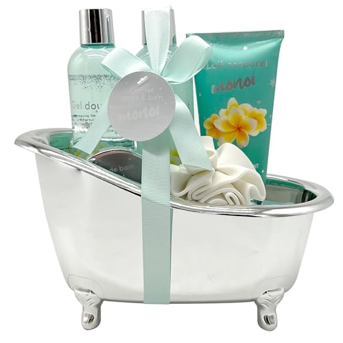 French Tendance - Coffret Bain Argent-Monoï - Gel Douche 260ml, Lait Corporel 190ml, Bain Moussant 260 ml, Sels de Bain 80g, Fleur de douche - Cadeau Femme Beauté - Kit Cocooning Baignoire