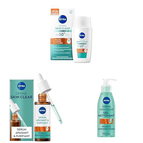 NIVEA LOT Derma Skin Clear : Fluide Anti‑UV FPS50+ 40 ml + Sérum Purifiant 30 ml + Gel Nettoyant 150 ml – Routine Anti‑Imperfections – Matifie, Purifie & Désobstrue les Pores