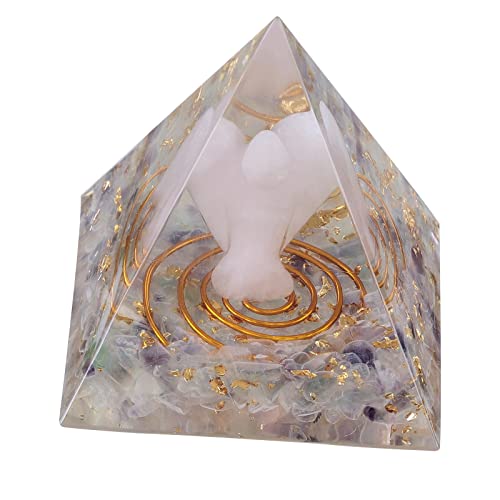 KYEYGWO Fluorite Reiki Fengshui Crystal Pyramids Gemstone avec Rose Quartz Angel, Positive Guardian Angel Pyramid, Figurines en Pierre, Ornement de Bureau, Décoration d'intérieur
