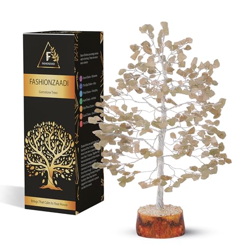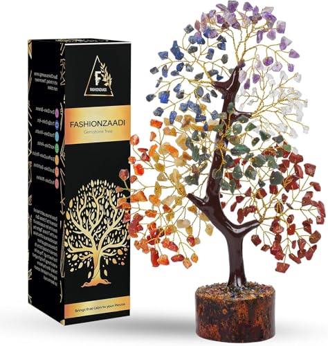 FASHIONZAADI Seven Chakra Gemstone Tree - Healing Crystal Money Trees Feng Shui Gift Handmade Reiki Crystals & Stone Home Office Table Décor Good Luck Throat Chakras Size 10-12 inch (Golden Wire)
