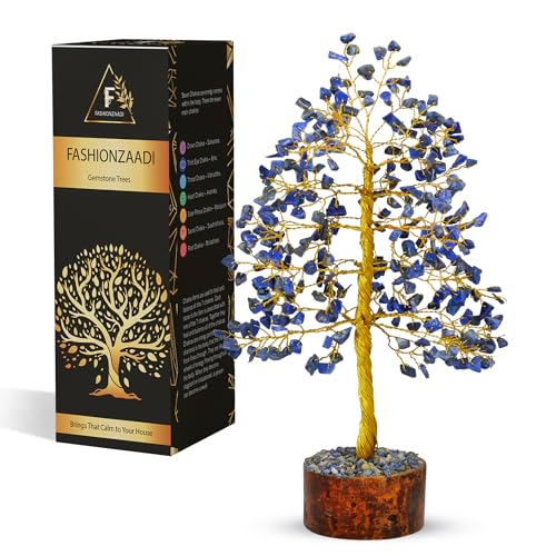 FASHIONZAADI Lapis Lazuli Gemstone Tree Healing Crystal Chakra Bonsai MoneyTrees Reiki Stone Good Luck Crystals Home Office Table Décor Decorative Figurine Gift Size -10 inch (Golden Wire)