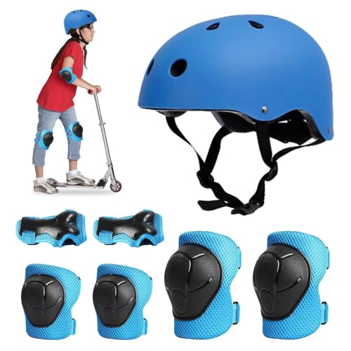 basku 7Pcs Casque VéLo Enfant Set, 3-15 Ans Casque RéGlable, CoudièRes GenouillèRe ProtèGe-Poignets Protection Trottinette Skateboard, pour Patin, VéLo, Skateboard, Scooter - Bleu