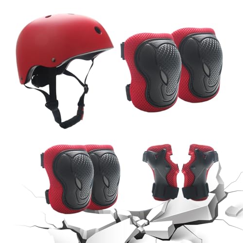 7Pcs Casque VéLo Enfant Set, 3-15 Ans Casque RéGlable, CoudièRes GenouillèRe ProtèGe-Poignets Protection Trottinette Skateboard, pour Patin, VéLo, Skateboard, Scooter - Rouge