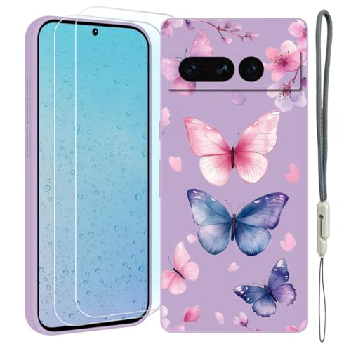 YonderYM Compatible avec Google Pixel 7,Coque avec 2 Pieces Verres Trempés avec 5 Papillons Motif Housse de téléphone Protection Souple en Silicone Mince Bumper