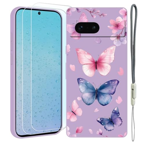 YonderYM Compatible avec Google Pixel 7A,Coque avec 2 Pieces Verres Trempés avec 5 Papillons Motif Housse de téléphone Protection Souple en Silicone Mince Bumper