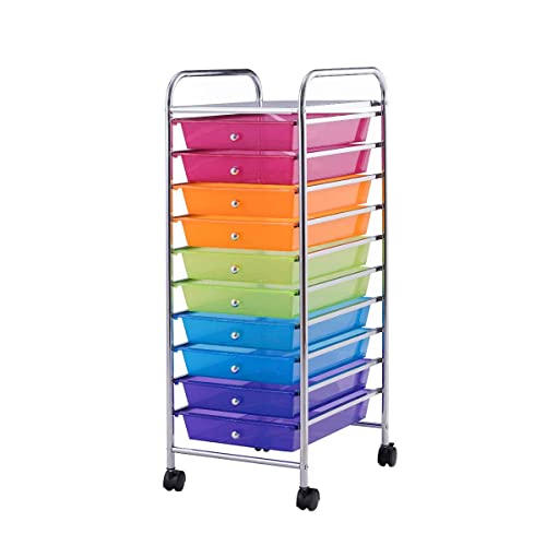 GIANTEX 10 Tiroirs Chariot de Rangement, Tour de Rangement Bureau sur roulettes, Desserte à roulettes Verrouillables avec Cadre Métal, Idéal pour Bureau, Salon, Chambre, 63x37x87CM (Multicolore)