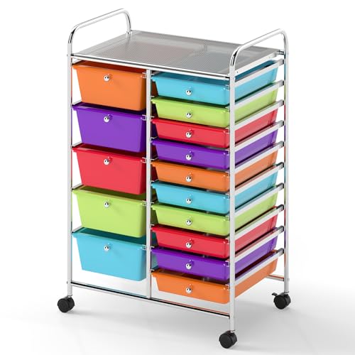 GIANTEX Chariot de Rangement 15 Tiroirs, Tour de Rangement à Roulette, Multifonctionnel Desserte à Roulettes Verrouillables avec Cadre Métal, pour Salon, Chambre 63x37x87CM (Multicolore Foncé)
