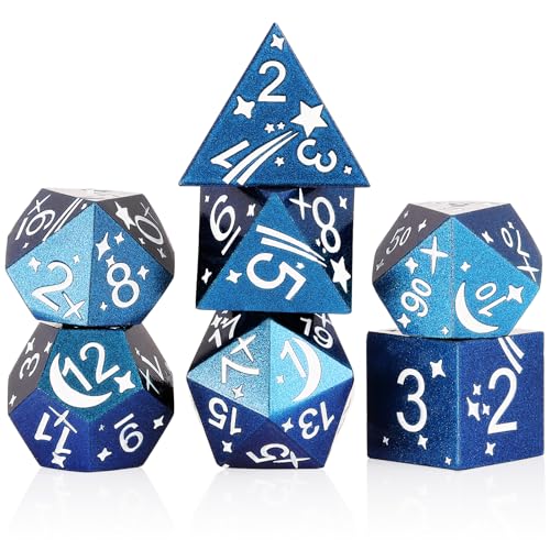 Metal DND Dice Set 7 PCS Role Playing Dice Star&Moon Metallic Polyhedral D&D Dice with Gift Metal Box for Dungeons and Dragon Tabletop Game(Blue Glitter with White)