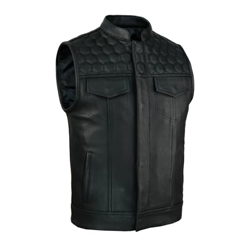 Leatherick Gilet de moto en cuir véritable style nid d'abeille SOA pour homme avec poches de transport dissimulées (FR/ES, Numérique, 46, Taille normale, Taille normale, Noir)