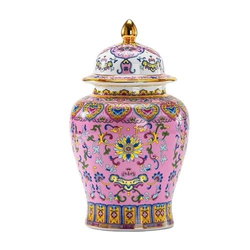 Vase en céramique Rose Multicolore, Pot à Gingembre pour la décoration intérieure, Vase en Porcelaine avec Couvercle, Centre de Table Style Temple (Grand modèle Rose)