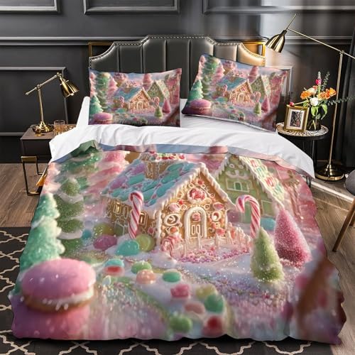 VOXYTMLWG Gingerbread House Parure de Lit 3D Imprimée Microfibre 3 Pièces Éclair Douce Coon Festive Linge de Lit Hypoallergique Entretien Facile for Adolescent Double(200x200cm)