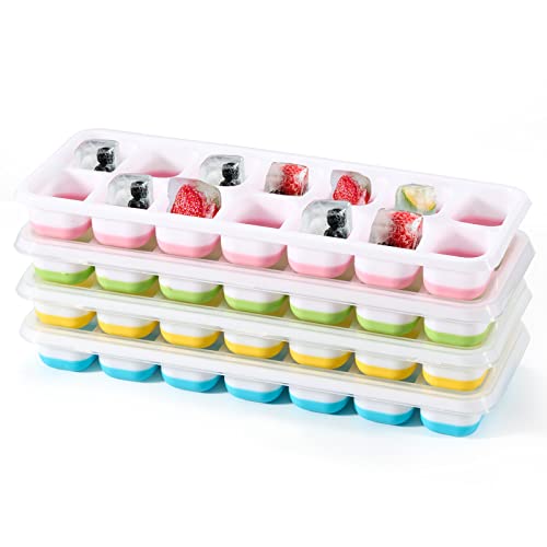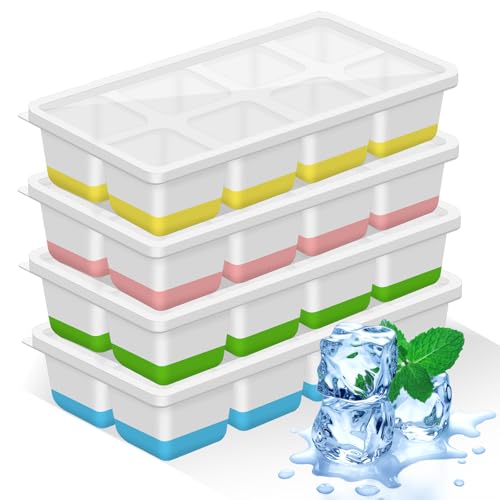Lot de 4 Bac à Glaçons avec Couvercle, Bac Glacon Silicone 56 Glacons, Sans BPA, Démouler Rapide, Empilable, Reutilisable, Bacs à Glaçons Carrés Faciles à Retirer