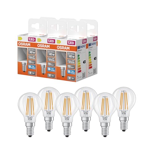 OSRAM Lampe LED Star Globe P40 Filament, 6 500 K blanc froid lumière du jour, 3,4 W, E14, transparente, 470 lm, pour luminaires de table et suspendus, 15 000 h,6-Pack