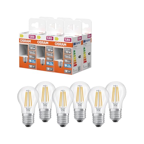 OSRAM Lampe LED Star Globe P40 Filament, 6 500 K blanc froid lumière du jour, 3,4 W, E27, transparente, 470 lm, pour luminaires de table et suspendus, 15 000 h,6-Pack
