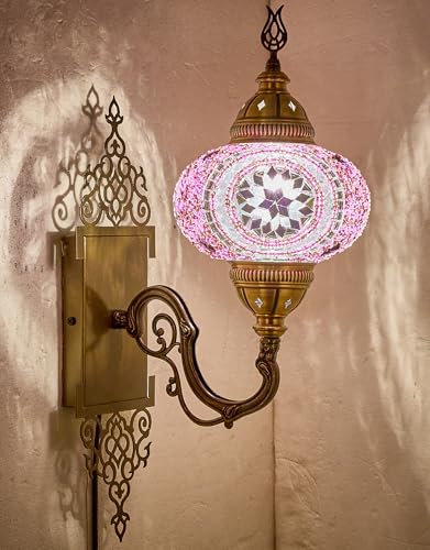 DEMMEX Applique Murale Turque Marocaines en Mosaïque, Globe en Verre Fait Main, Base en Laiton, Cordon 1,5 m, Éclairage Décoratif pour Salon et Chambre Lilas