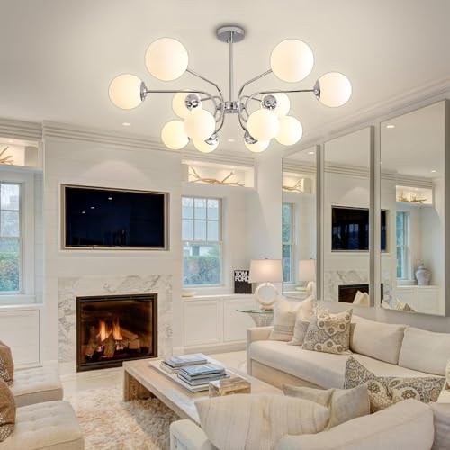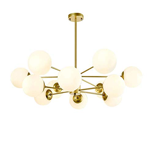 LYSDjia Lustre Spoutnik moderne 12 lumières avec abat-jour globe en verre opale blanc de 15cm plafond plat et incliné hauteur réglable pour cuisine salon salle à manger chambre à coucher Suspension(Ch