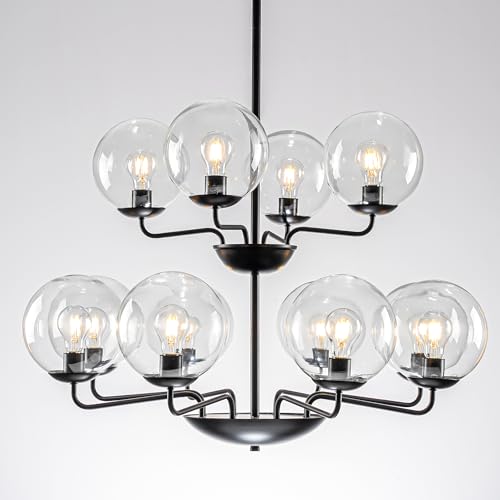 Bakspa Lustre globe noir avec abat-jour en verre transparent à 2 niveaux, 12 lumières, 81,3 cm, grand luminaire de ferme, éclairage rustique vintage pour salle à manger, cuisine, îlot, entrée