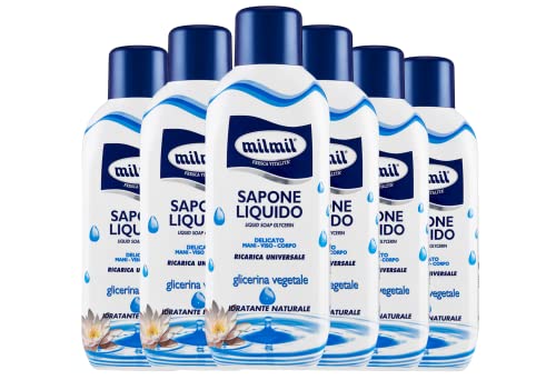 milmil Savon Liquide Glycérine végétale Recharge Universel 6 pièces x 1000 ml, Savon Manins Recharge, Savon Visage, Corpo, pH Physiologique, Formule Hydratante, Dermatologiquement testée