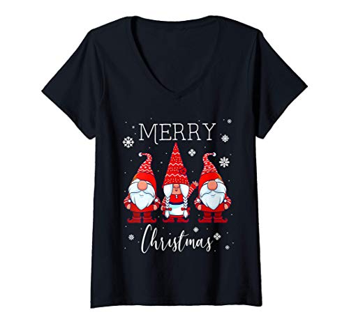 Femme Trois Gnomes en Buffalo Plaid Joyeux Noël GNOME T-Shirt avec Col en V