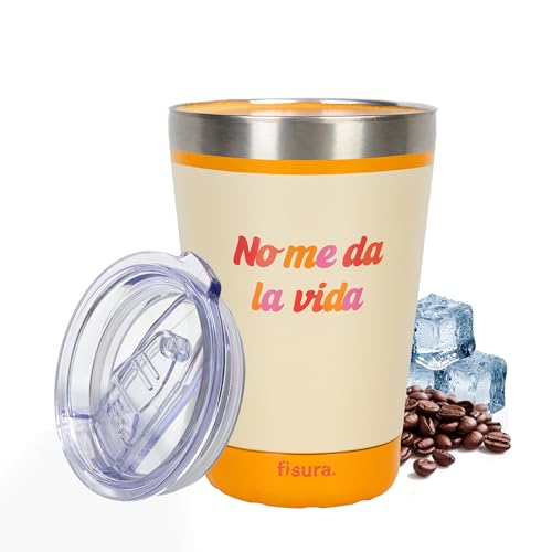 Fisura – Mug isotherme original “No me da la vida”. Gobelet thermique nomade orange pour café à emporter 310 ml. Tasse isotherme en acier inoxydable pour voiture. Sans BPA. Idée cadeau amusante